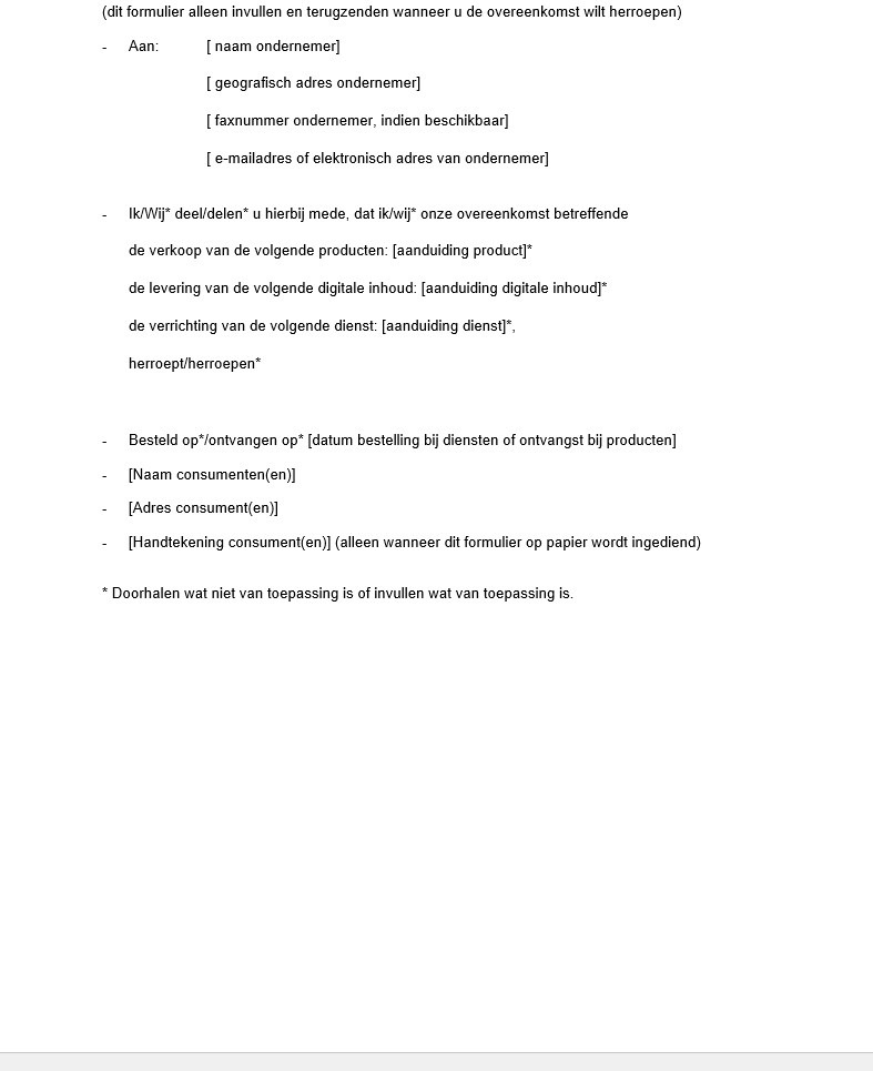Modelformulier voor herroeping: het in Bijlage I van deze voorwaarden opgenomen Europese modelformulier voor herroeping. Bijlage I hoeft niet ter beschikking te worden gesteld als de consument ter zake van zijn bestelling geen herroepingsrecht heeft;